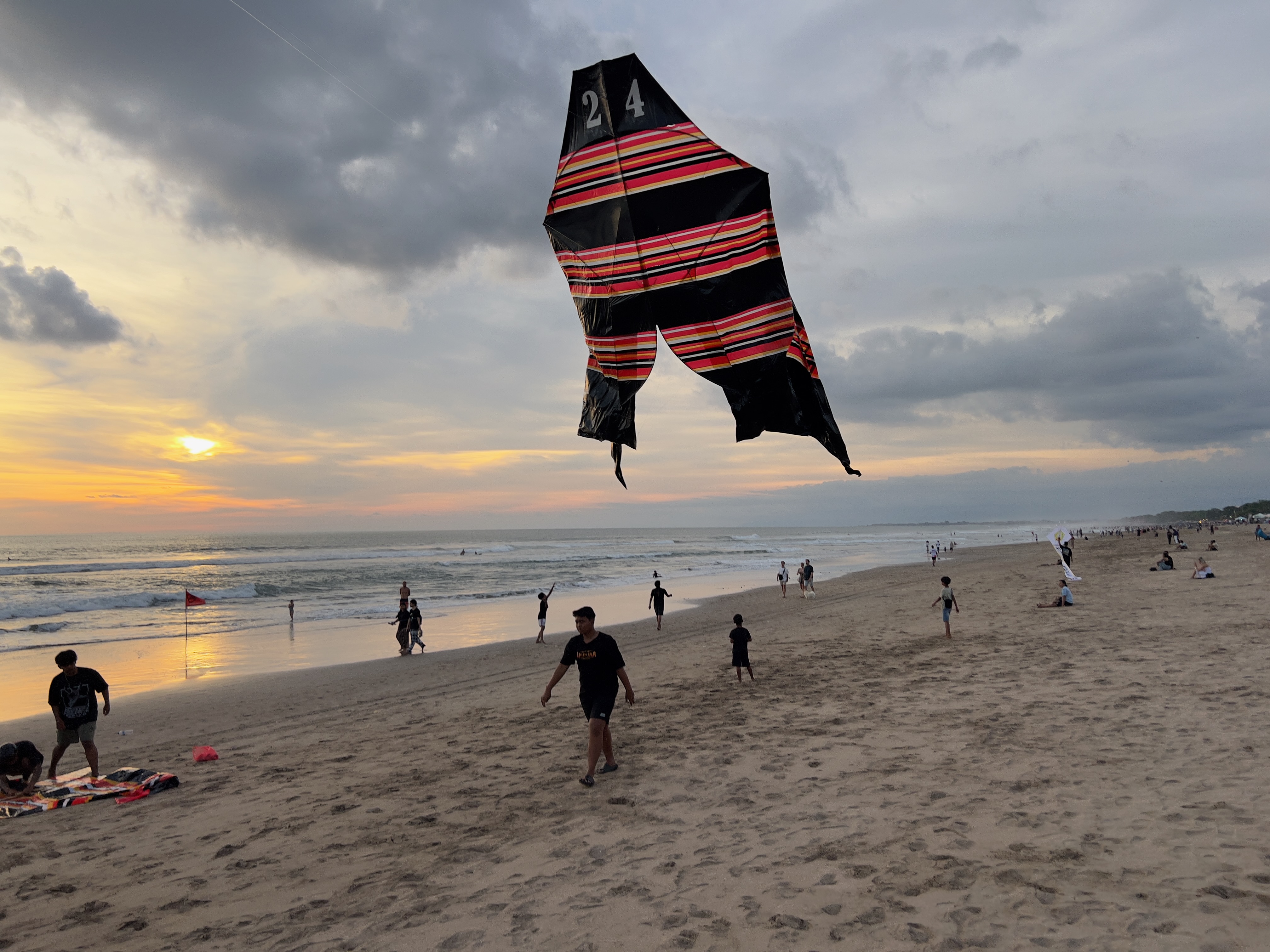 Denpasar’s energy was a big contrast to Tulamben and Lembeh, scooters everywhere, and beaches full of life. The first afternoon, after we arrived, we enjoyed a chill beach-club session in the Legian Beach area, soaking up the sun and slow vibes. Before dinner, we took a walk along the shoreline, watching locals prepare enormous kites for a kite festival. Teams were shaping frames, tuning strings, and laying out bright fabrics—all right on the sand.