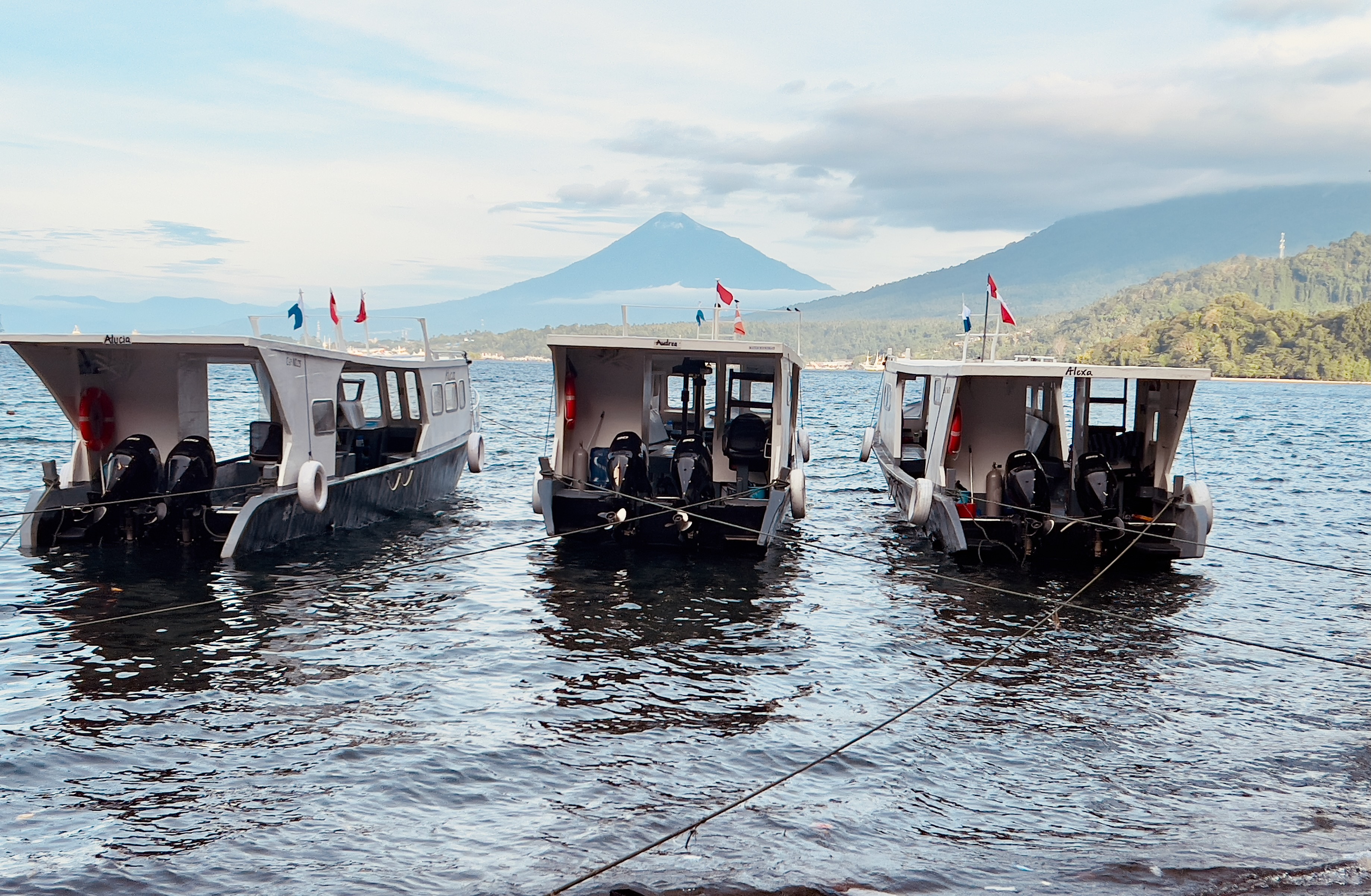 Lembeh Resort dive boats with Mount Tongkoko in the background
