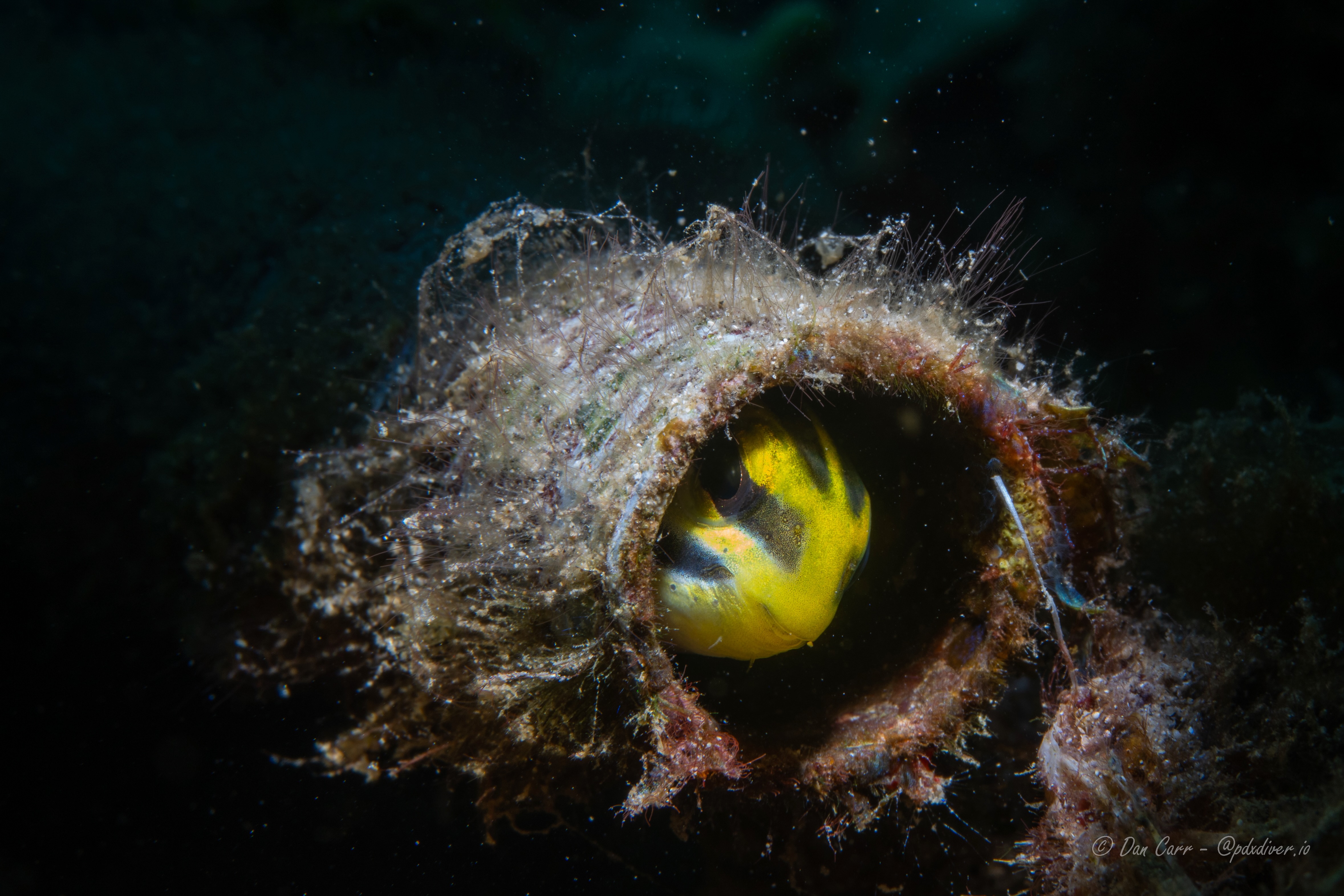 Brian and Melinda on the boat to Lembeh Resort And then… Lembeh. This stretch of the trip gave us more macro subjects to capture, and the next set of photos highlights some of our favorite finds. We came across juvenile sweetlips, plenty of expressive blennies, a surprisingly cooperative blue-ring octopus, several frogfish, and more than one curious cuttlefish. Lembeh did not dissapoint.